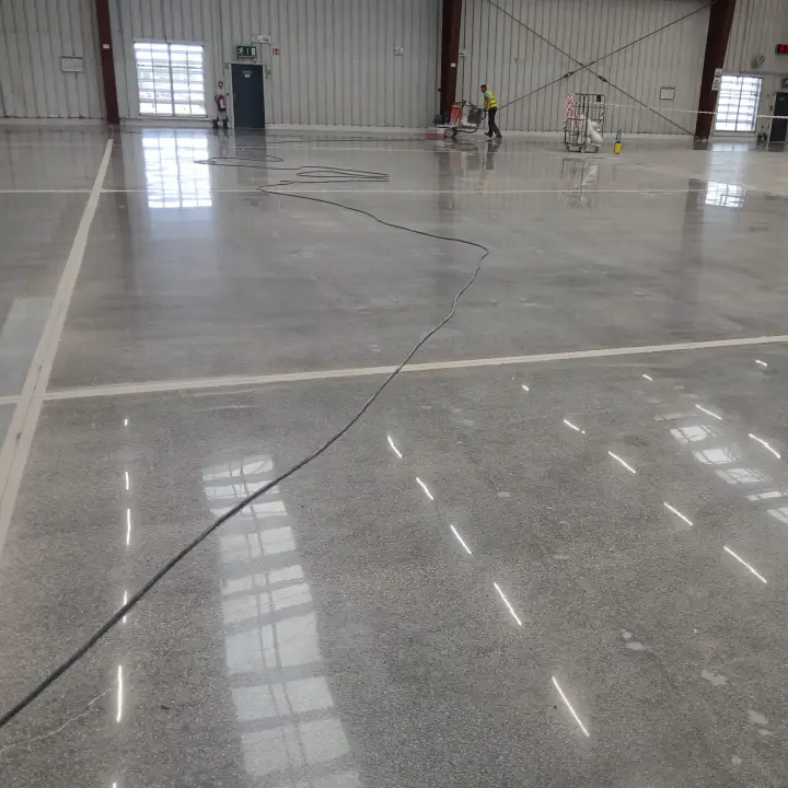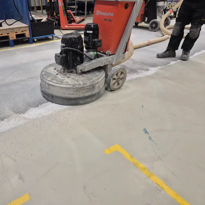 We have been delivering polished concrete floors since 2006. In short, polishing concrete with planetary grinders changes the surface of a concrete floor to achieve a desired level of smoothness. An indirect effect of polishing concrete is exposing the aggregate in the floor and a desired level of gloss. To increase protection against liquids and dirt penetration, we use specialized reactive sealers during and at the end of the polishing process.